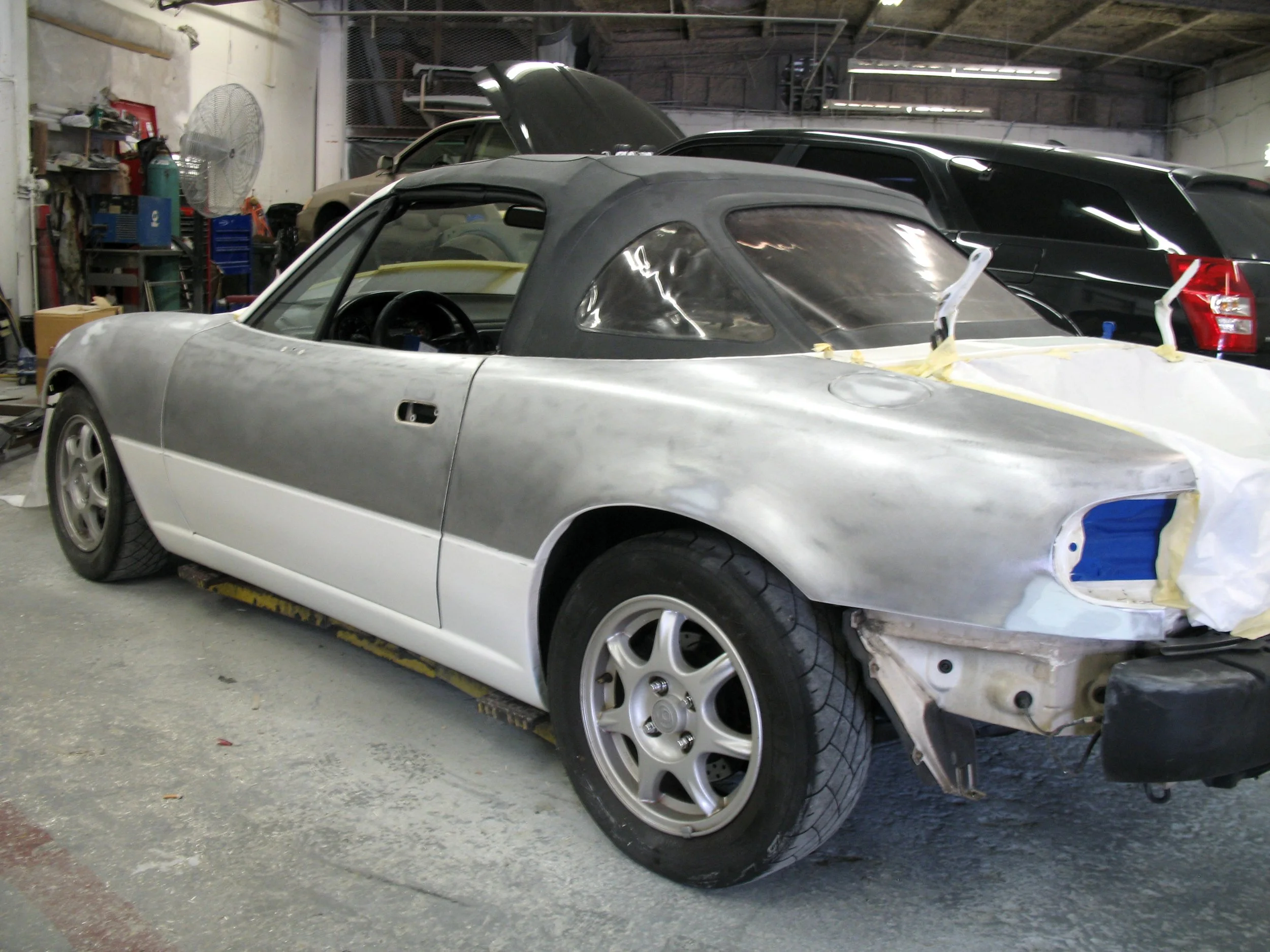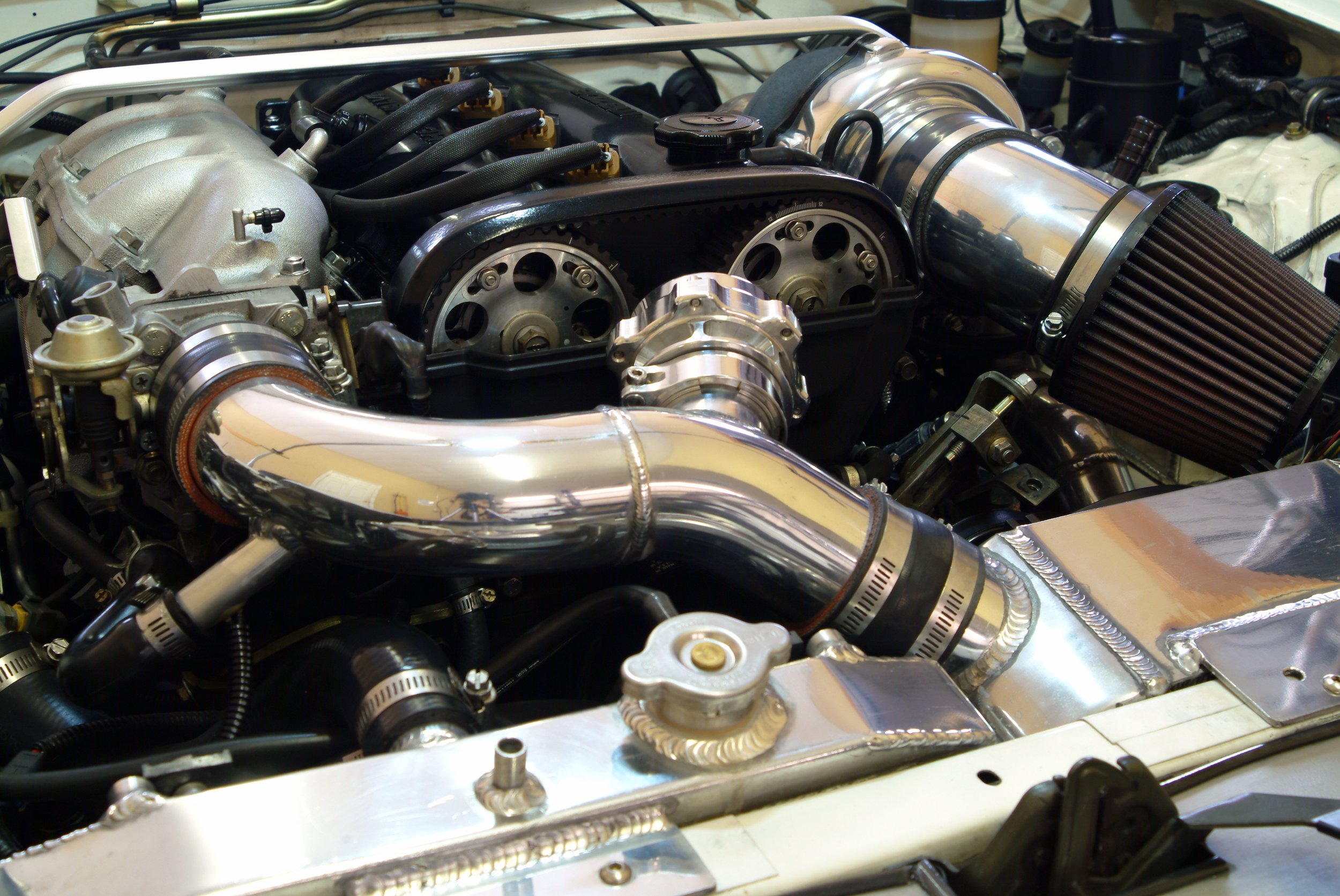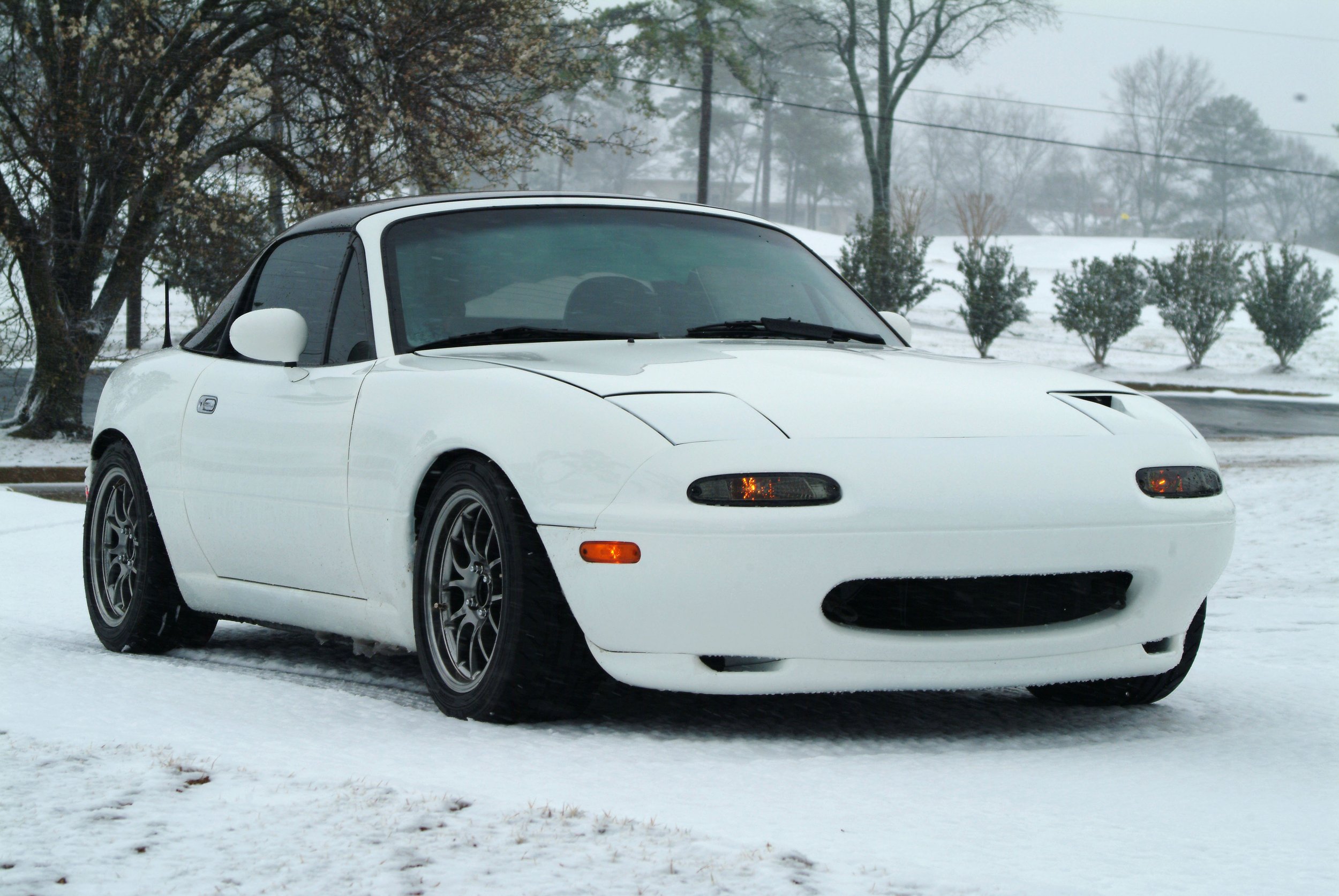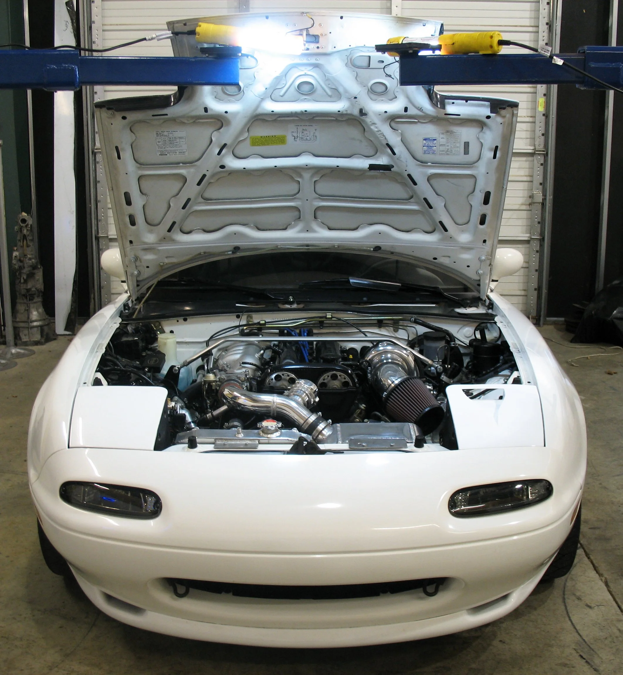 The car started life with Stan with the standard 1.6L engine. Because he has another fire-breathing turbo Miata already (!), he decided that this would be a mildly breathed-upon car for daily use. A comfortable Miata by comparison. The cars 1st engine build included a 94 1.8L bottom end and a 99 head. This setup made 136 WHP. He drove the car for over a year before a mild non-intercooled turbo setup was installed. After some time the factory oil pump gave up. It was time for a forged internal motor. The engine was intended to be strong enough to handle as much as 500 hp so that he could safely produce 300 hp without danger to the motor. To maximize throttle response, he shortened the intake length. The theory is that this shorter length minimizes the time for the air to move from the turbo to the pistons.