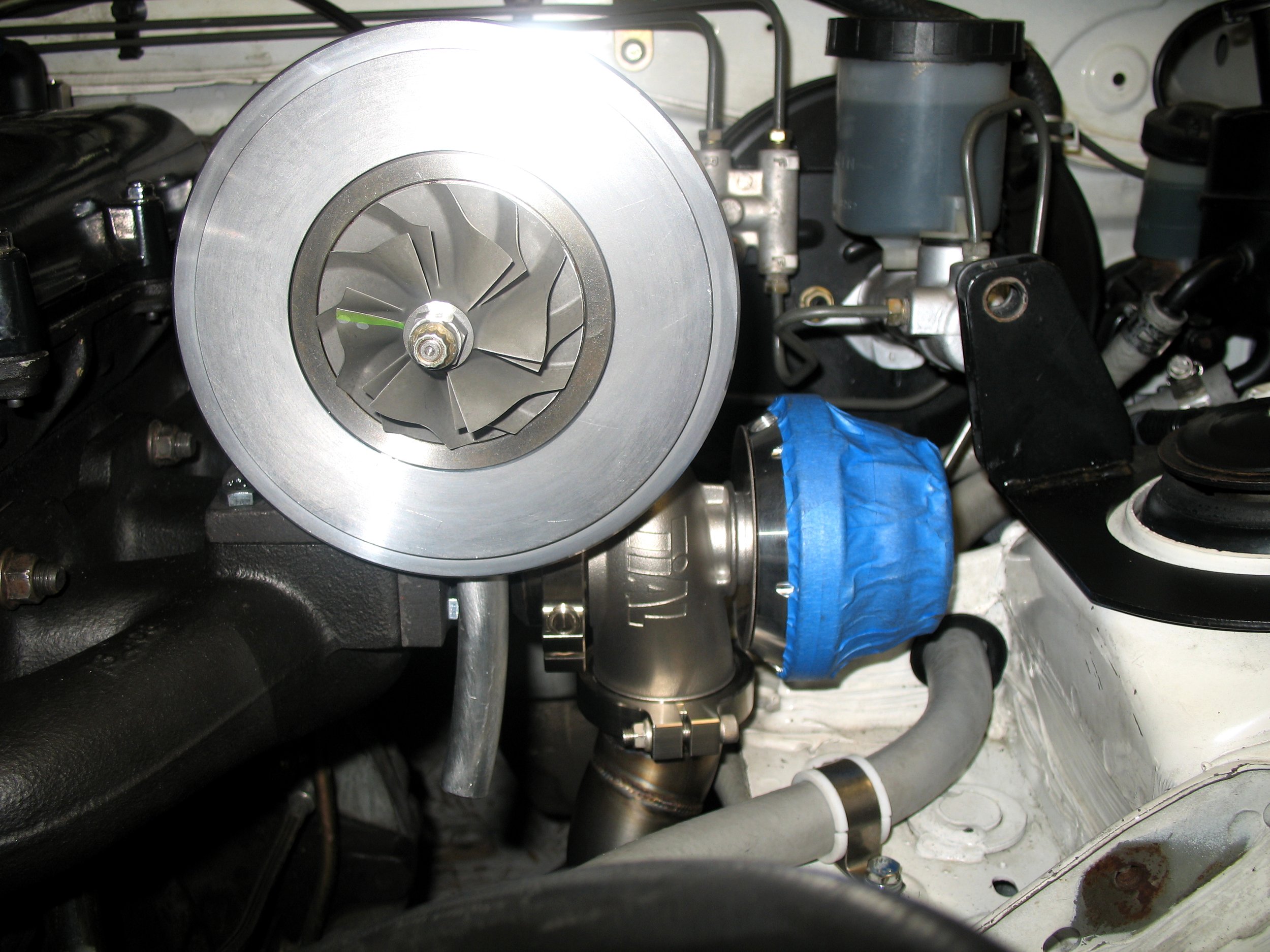 The turbo system that Stan has constructed is one of the most creative designs around. Not content to have either a solid 230 hp system that would be easy to drive or a demonic 300hp system that would be unhappy in traffic, Stan has a novel solution that allows him to have his cake and eat it too. The system is built around a Garrett GT2871R Turbocharger, with an oversized 4" compressor housing. The car has 2 separate wastegates. The internal wastegate is set to 10 psi and is used for quiet daily driving. This is the configuration that delivers 230hp to the ground. A solenoid allows switching to the larger external wastegate set to 18psi, thus allowing 300 hp to assault the tarmac. Such a complicated system appears to be simple from the drivers seat when a mere flip of a switch toggles from one system to the other.
