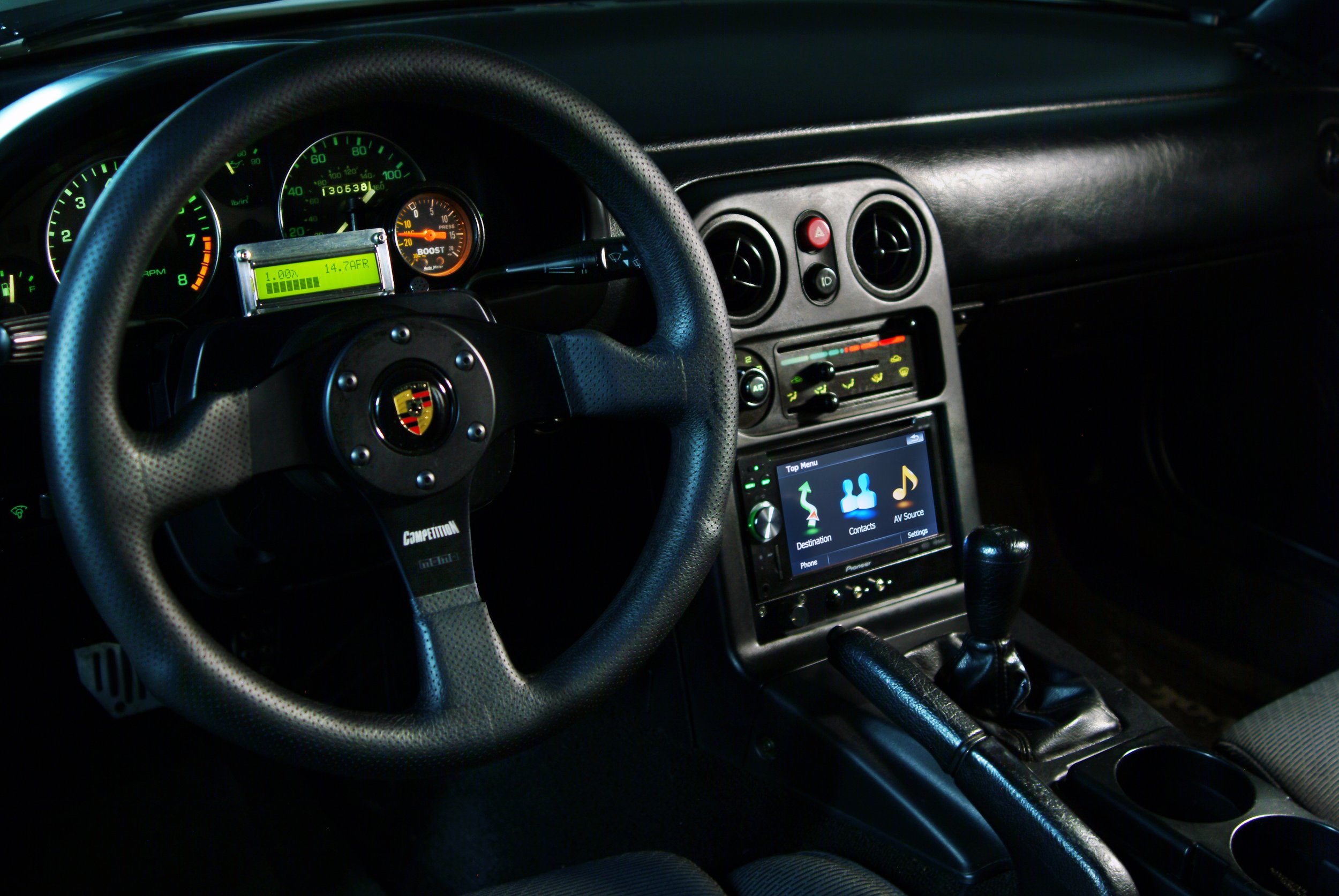 When you approach the car, the most striking feature is not any of the mechanical miracles within, but the absolute cleanliness of the car. It strikes one as a new car, though it is now 17 years old. It was recently repainted and debadged, but it also sports a set of smoked turn signal lenses on the front, which make the paint work all the more striking. The stance is better than original, as the car is lowered, riding on a Spec-Miata suspension and 6UL 15x8" wheels. The car does not scream "LOOK AT ME!" as some modified cars do, but it rewards a second look with a rich texture that attention to detail always delivers.